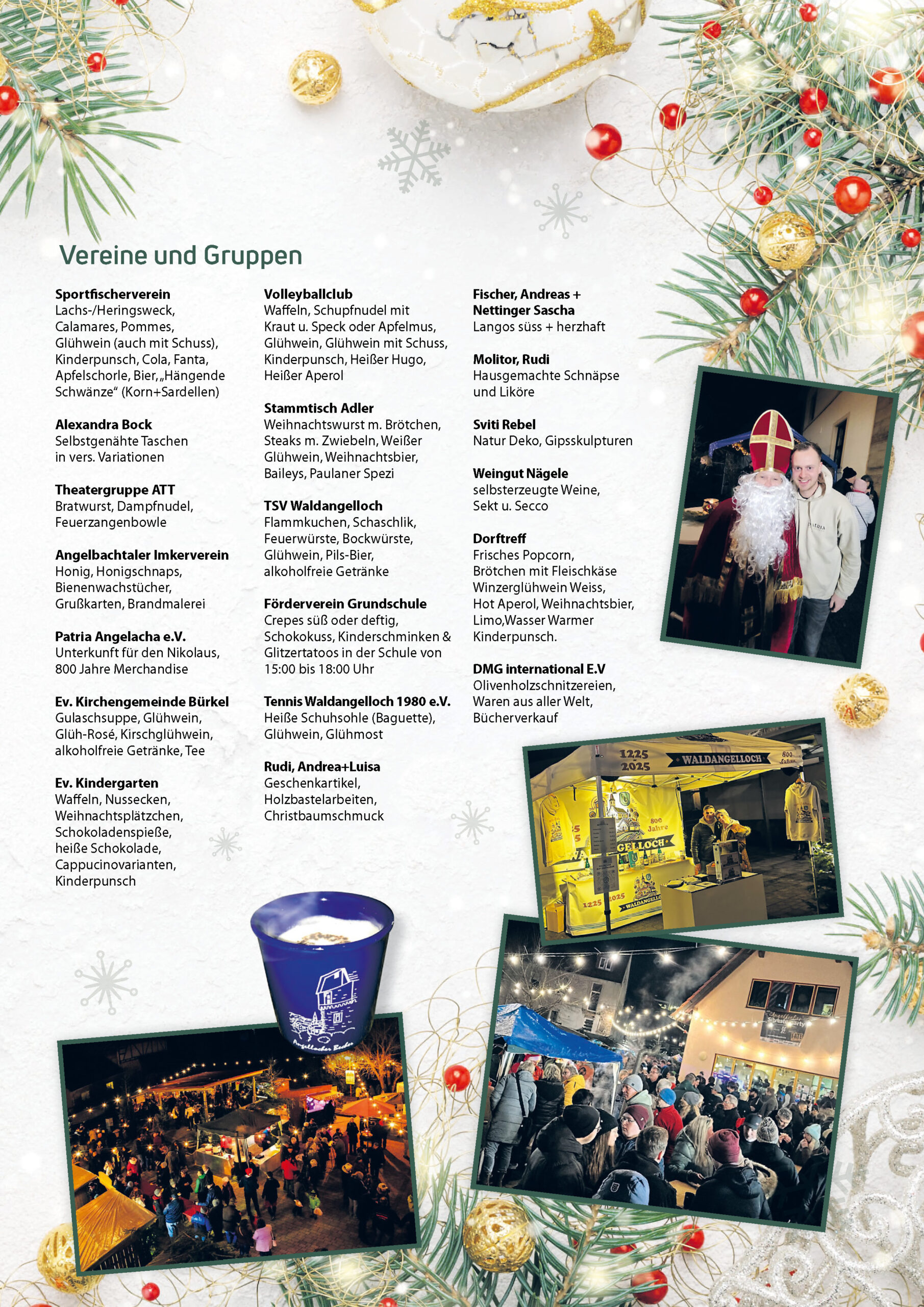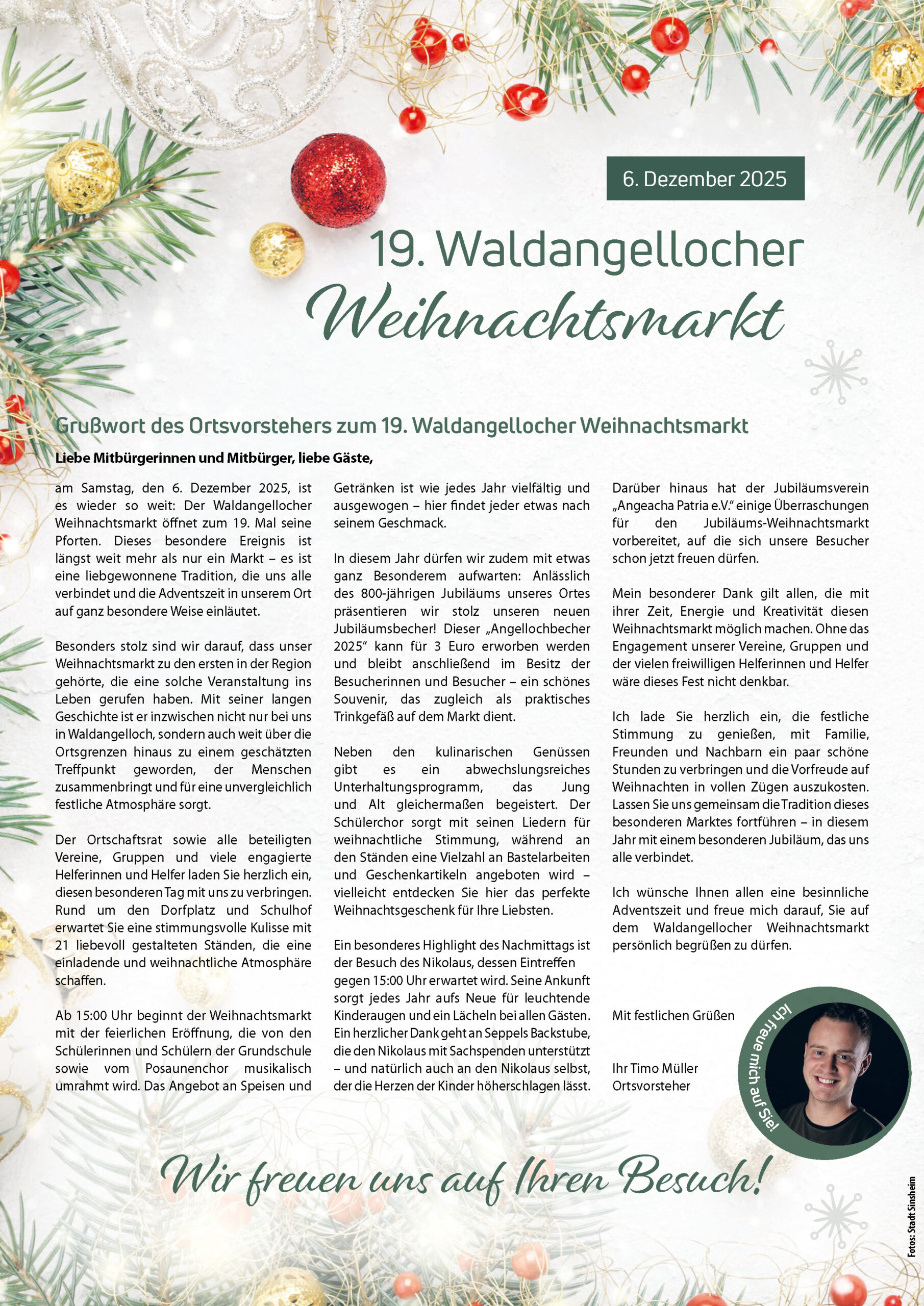 Am Samstag, den 6. Dezember 2025 findet ab 15:00 Uhr auf dem Dorfplatz / Schulhof der 19. Waldangellocher Weihnachtsmarkt statt. In 19 Hütten und Ständen bieten wir rund um das Schulgebäude die verschiedensten Köstlichkeiten zum Essen, trinken und naschen. Außerdem viele schöne handwerkliche Arbeiten.